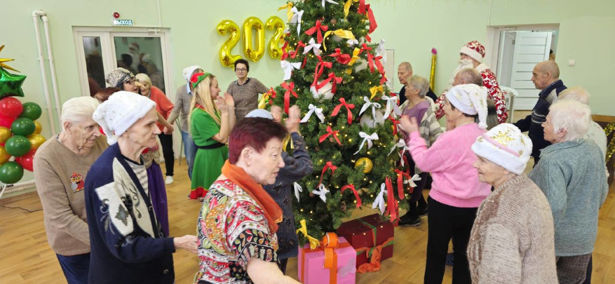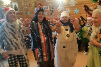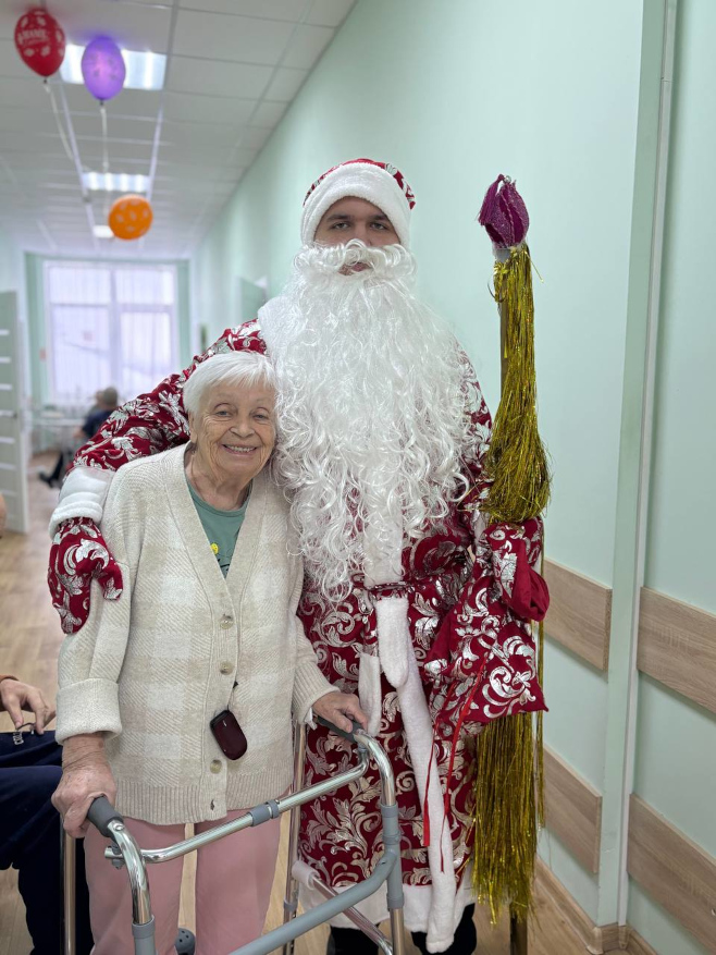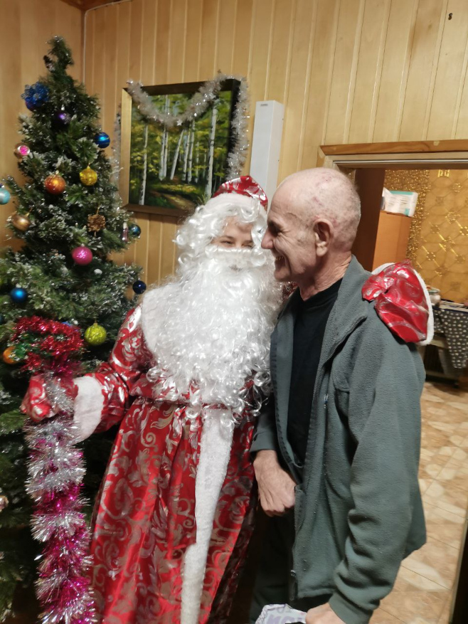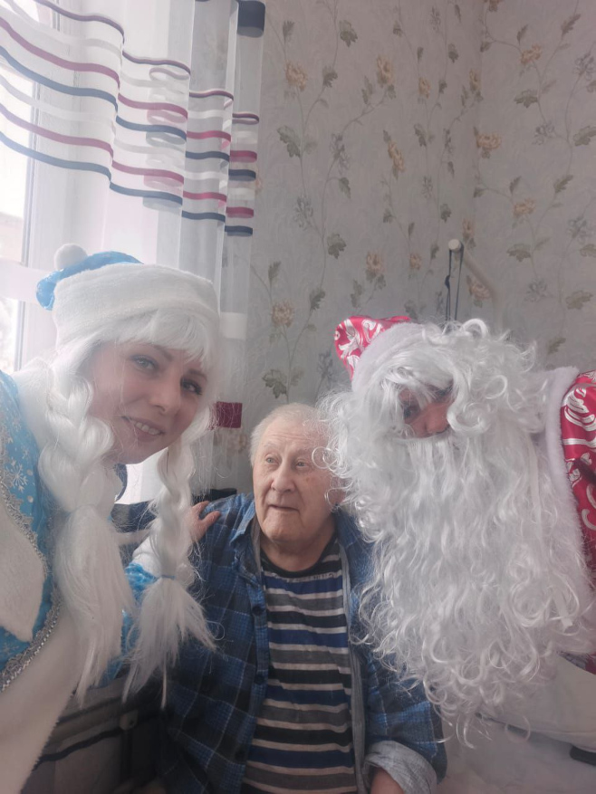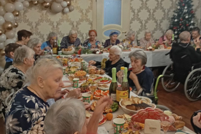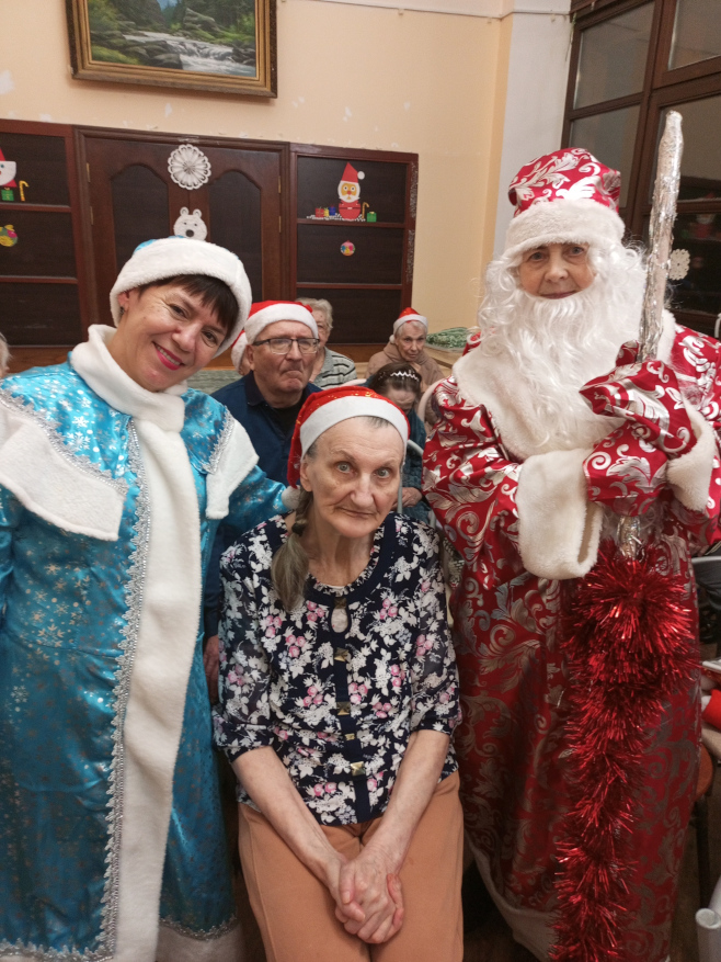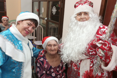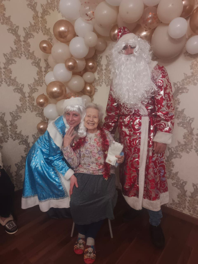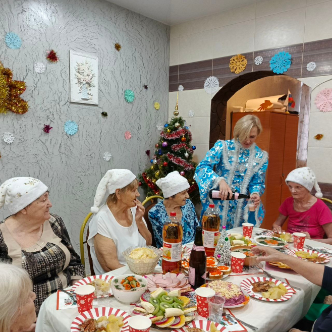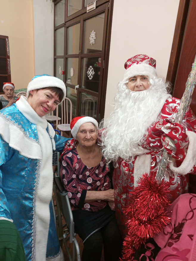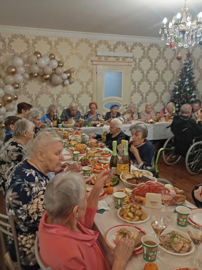 А еще в каждом пансионате развернулось широкое застолье с отличными угощениями! После поздравлений и вручения подарков все активные жильцы закружились в хороводах новогодней дискотеки! Наших маломобильных постояльцев Дед Мороз со Снегурочкой навестили в индивидуальном порядке. — Никто не остался без внимания и хорошего настроения!