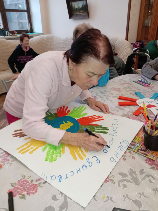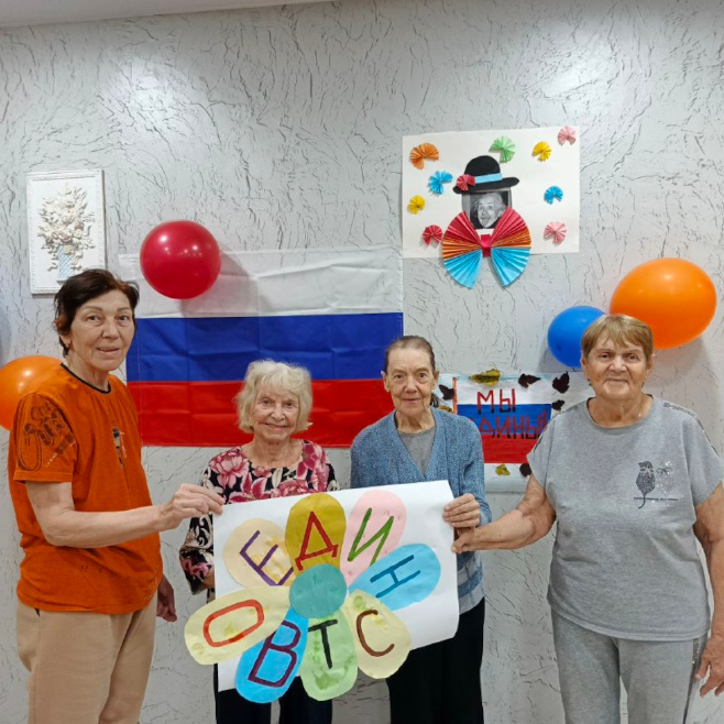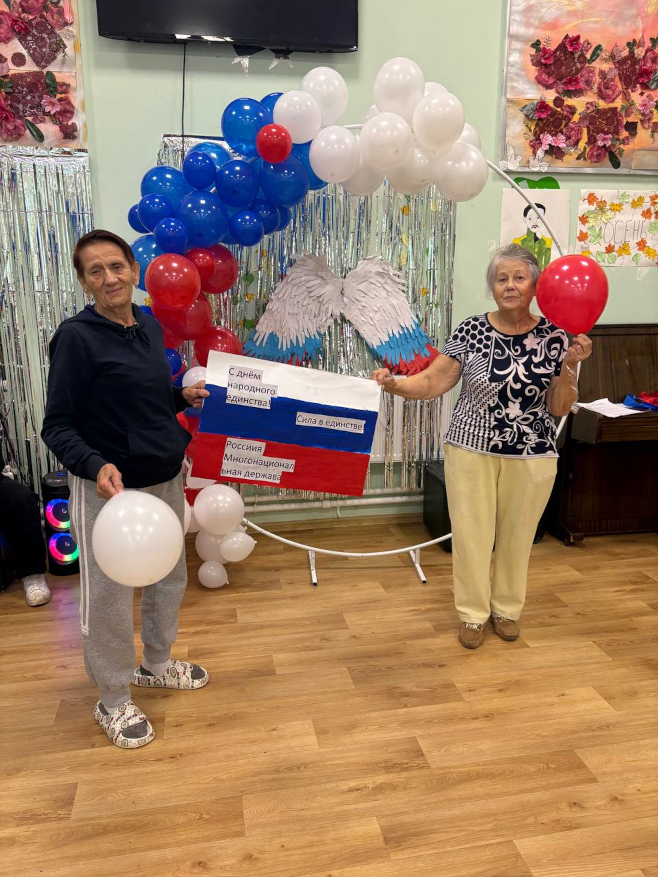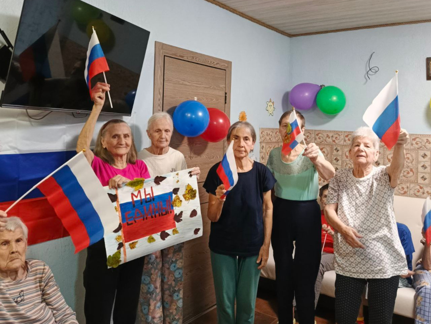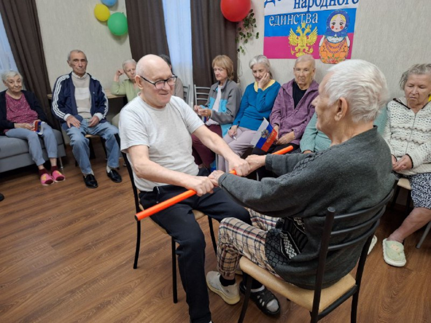 В наших пансионатах для пожилых людей День народного единства прошёл тепло, торжественно и по-настоящему празднично. Программа мероприятий была насыщенной и разноплановой — она объединила патриотические элементы, творческие задания и весёлые игры, позволив каждому участнику почувствовать себя частью большого общего дела.