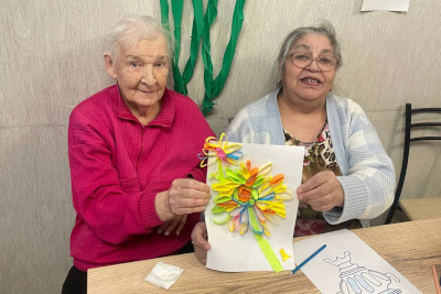 Эти праздники так и просились объединиться в творческую сессию. Поэтому мы рисовали, раскрашивали, делали аппликации и занимались квиллингом, а потом с удовольствием дарили друг другу свои работы. Обязательно навестили лежачих постояльцев, поделились с ними хорошим настроением и частичками своего творчества в виде открыток и рисунков.