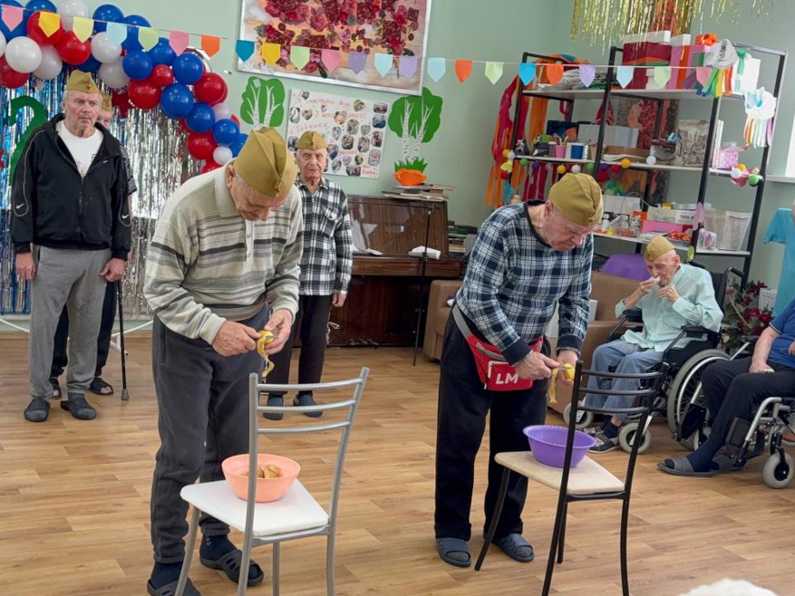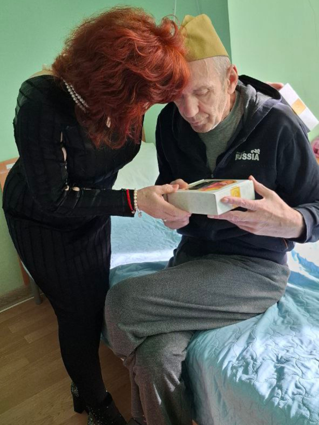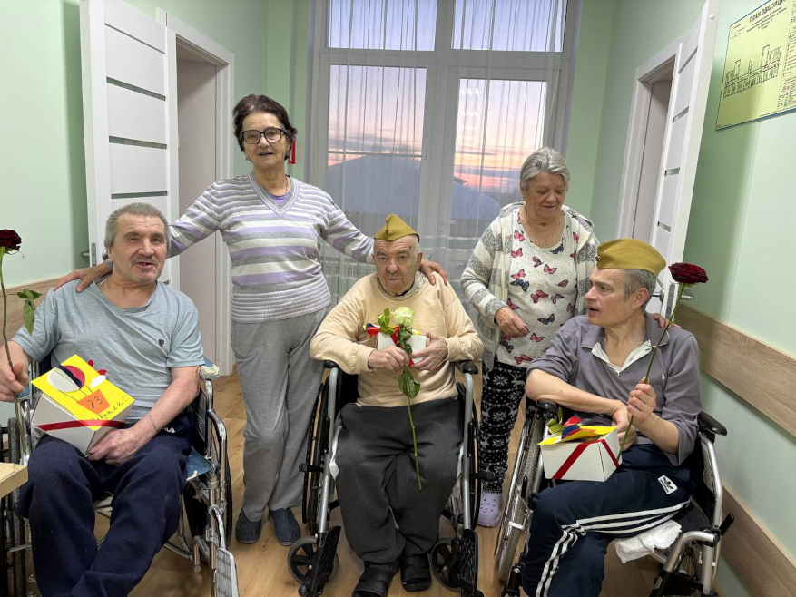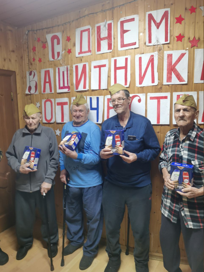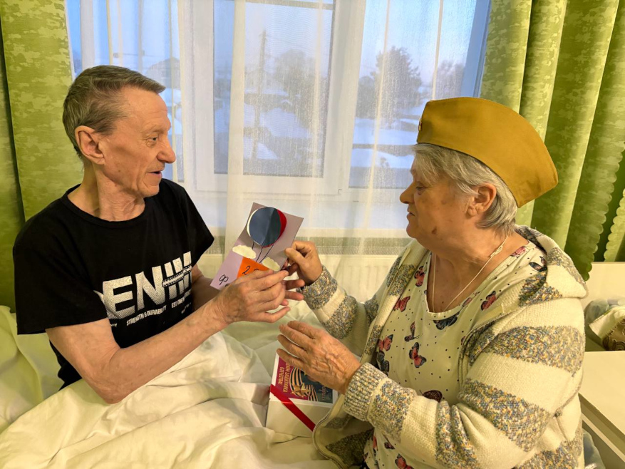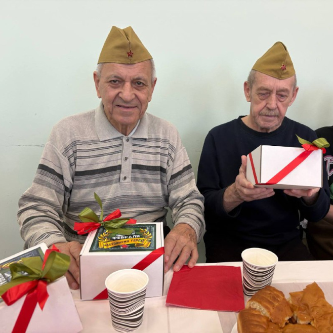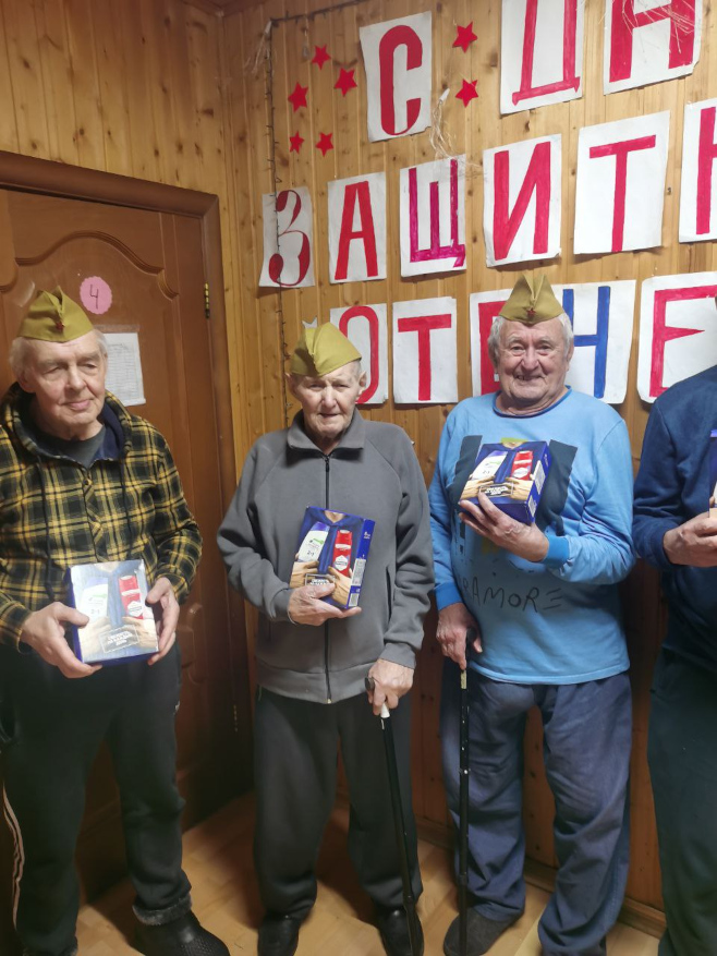 Каждому мужчине вручили небольшие подарки — символ внимания и благодарности. Особенно важно было поздравить и тех, кто маломобилен: сотрудники навестили их в комнатах, сказали добрые слова и передали подарки лично.
