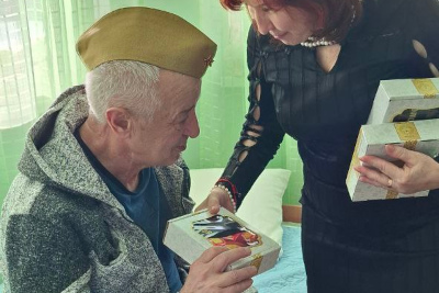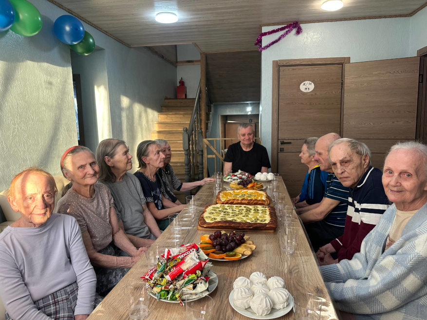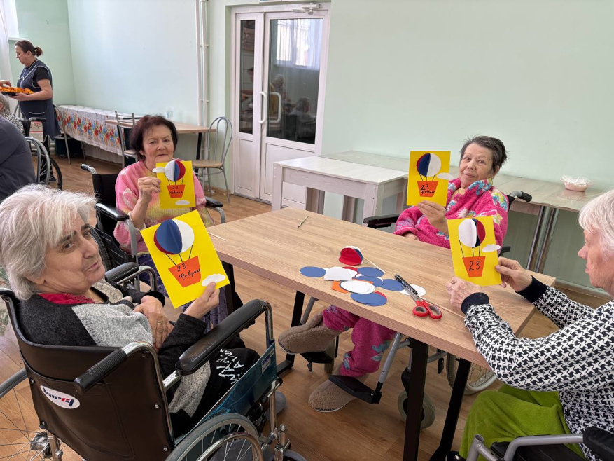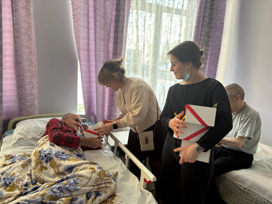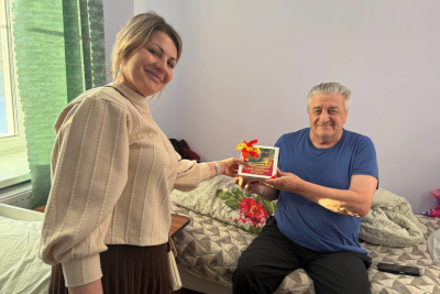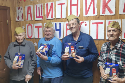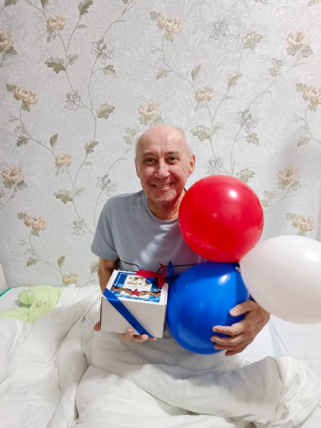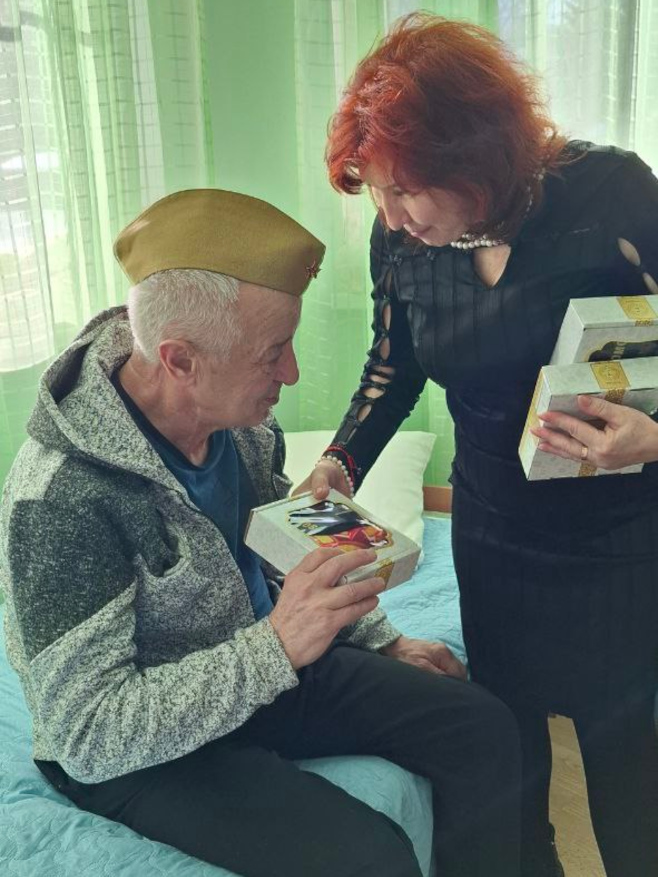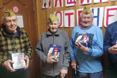 Каждому мужчине вручили небольшие подарки — символ внимания и благодарности. Особенно важно было поздравить и тех, кто маломобилен: сотрудники навестили их в комнатах, сказали добрые слова и передали подарки лично.