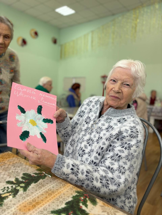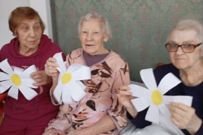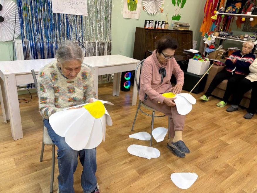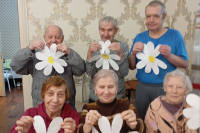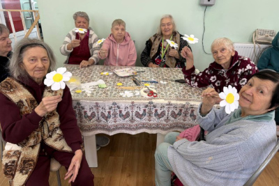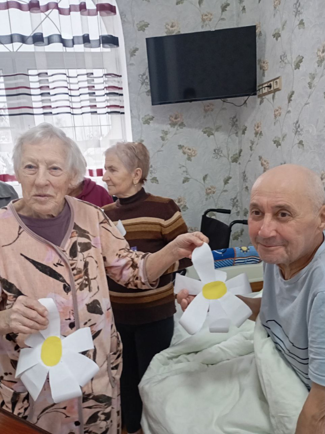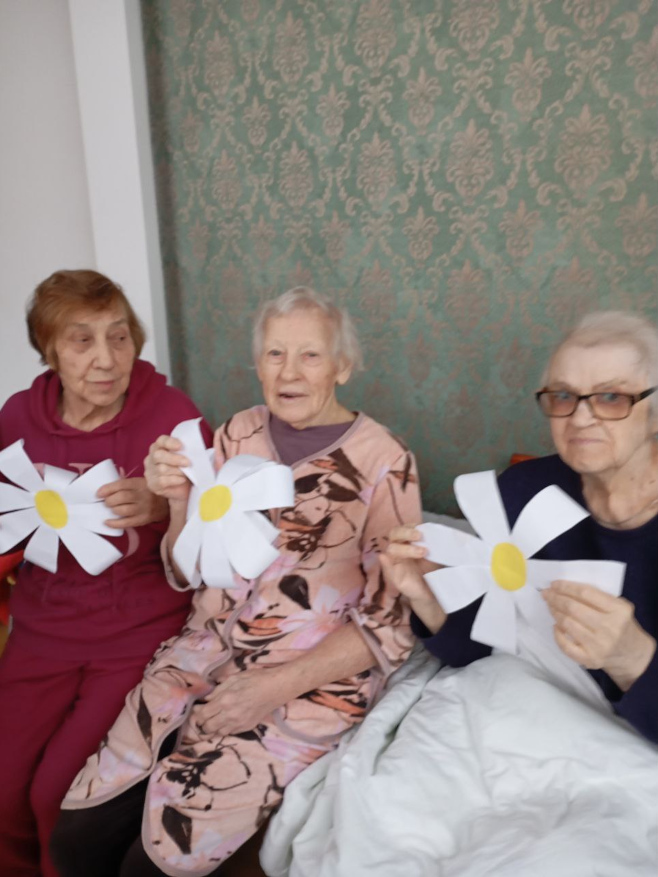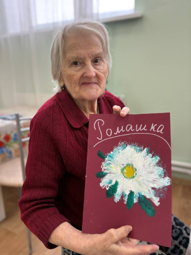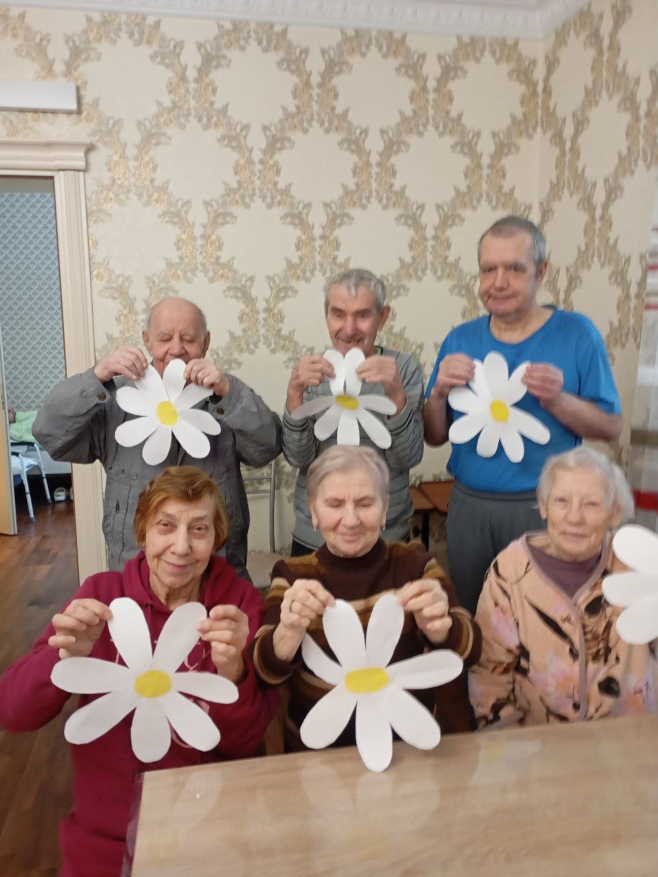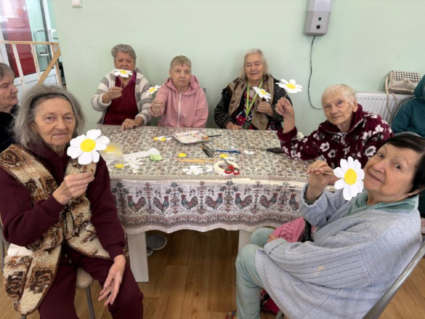 Вместе с постояльцами мы отгадывали загадки, связанные с природой и цветами, делали поделки, рисовали и раскрашивали ромашки, клеили яркие аппликации. Прошла и уютная фотосессия — с улыбками, цветами и отличным настроением.